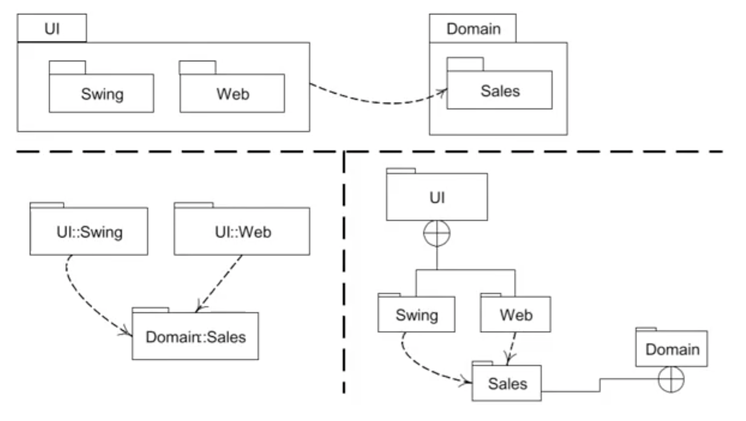 *점선화살표(의존관계), xor기호(중첩 페키지)