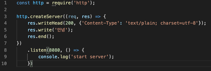 .createServer((req, res)=>{})를 통해 서버를 생성하고 listen()을 통해 서버 연결을 한다.