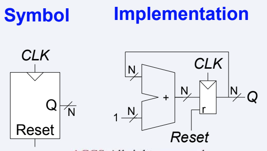 N-bit binary counter는 클럭, 리셋입력돠 N-bit 출력인 Q를 가지는 순차 산술 회로(sequential arithmetic circuit)이다. 리셋은 출력을 0으로 초기화 한다. 카운터는 가능한 모든 2^N개의 출력을 이진순서로 진행해 클럭의 상승 엣지에서 증가시킨다.