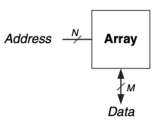 위 그림은 전형적인 memory array의 symbol을 보여준다. 이 메모리는 memory cell의 2차원 배열로 조직되어 있다. 이 메모리는 배열의 행 중 한 행의 내용에 대해 일기, 쓰기를 한다. 이 행들은 주솟값(address)에 의해 특정된다. 읽고 쓰여지는 값들은 데이터라 부른다. N-bit주소값과 M-bit데이터를 가지고 있는 배열은 2^N개의 행과 M개의 열을 가지고 있다. 각 행에 있는 데이터를 word라 부르기에 배열은 2^N개의 M-bit word들을 가지고 있다.