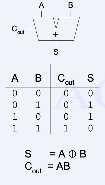 두개의 입력(A, B)와 두개의 출력(S, Cout)로 구성되 있다. S는 A, B의 SUM이며 만약 A, B가 모두 1이라면 1비트로 표현할 수 없으므로 Carry out인 Cout으로 나타낸다. Half adder는 XOR과 AND 게이트로 구성할 수 있다. Multi-bit adder에서 Cout은 다음 비트의 MSB에 더해지거나 carried in(Cin)된다. 하지만 Half adder의 경우 Cout을 받을 수 있는 Cin이 존재하지 않는다.