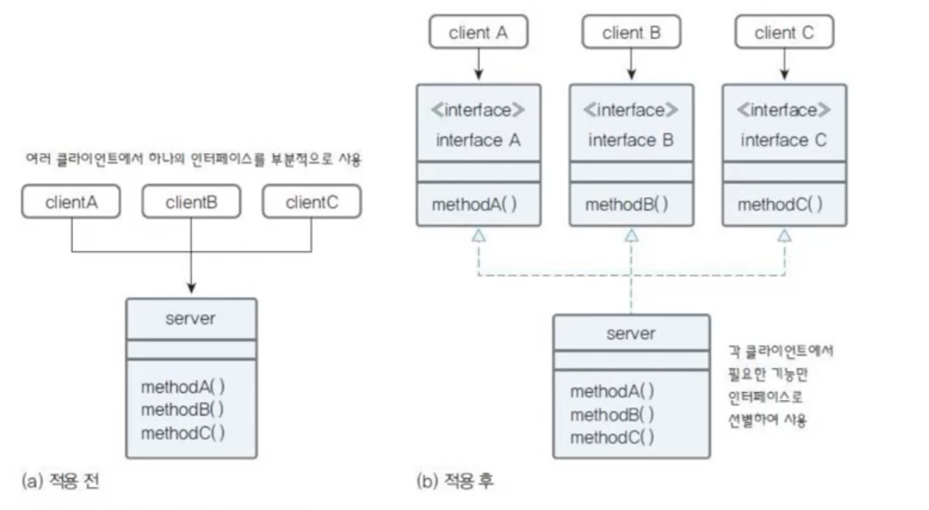 -클라이언트는 자신이 사용하지 않는 메서드와 의존 관계를 맺으면 안된다 -> 각 클라이언트에 맞는 인터펭시만 분리
