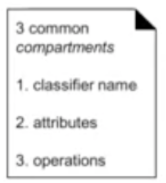 위그림에서 가장 큰 사각형같은 모양으로 클래스를 표시한다. 3개의 작은 사각형으로 나뉘어져있고 첫번째 사각형에는 클래스의 이름, 두번째에는 속성, 세번째에는 메서드가 들어간다. 클래스, 인터페이스, 유스케이스, 액터를 이를 통해 표현한다