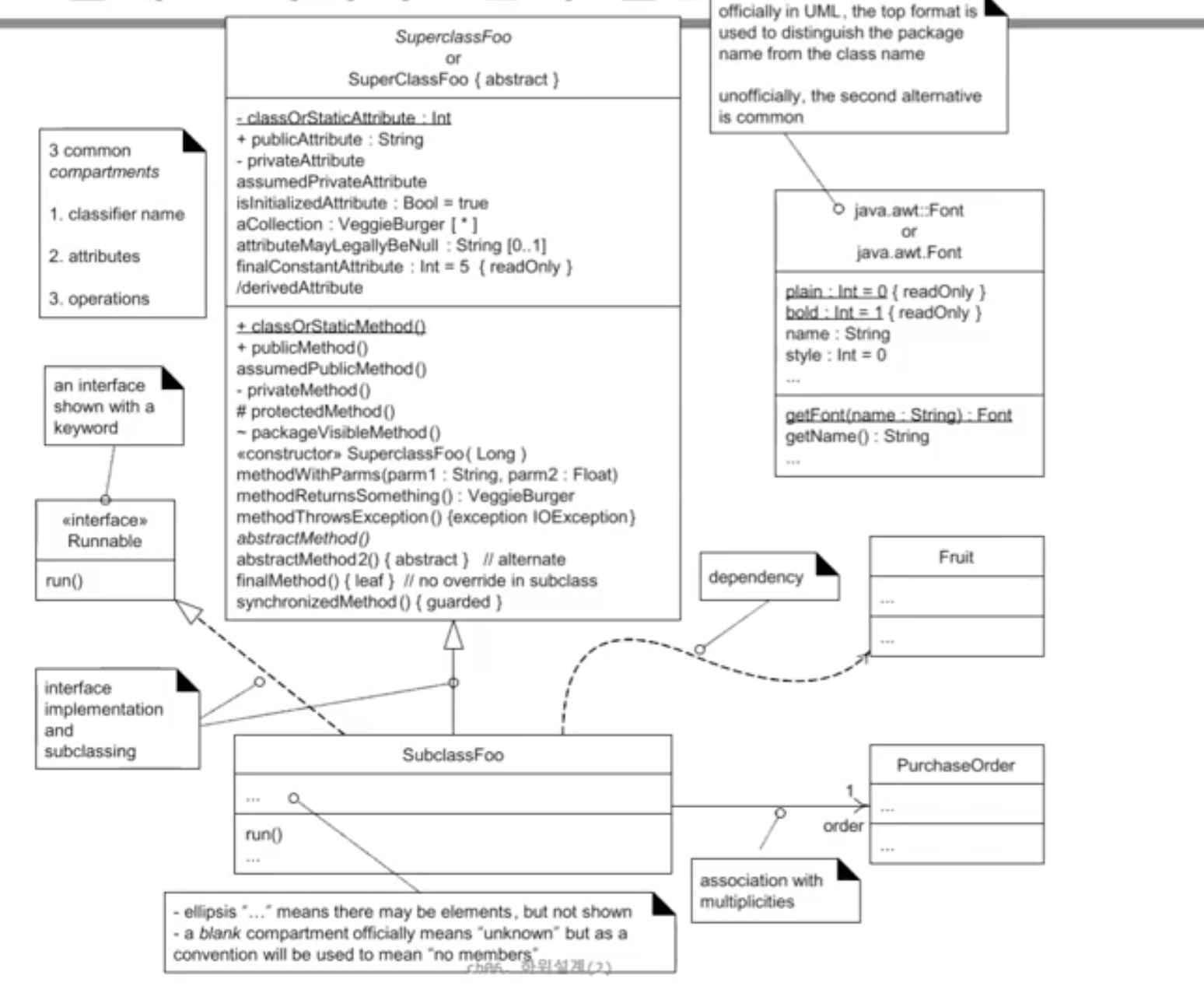 인터페이스: <<interface>>로 표시, 속이 빈 삼각형, 점선