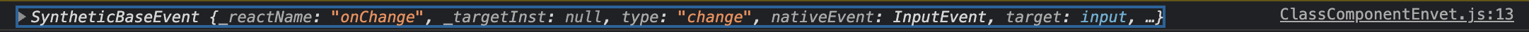여기서 콘솔레 출력되는 e객체는 SyntheticEvent로 웹 브라우저의 네이티브 이벤트를 감싸는 객체이다. 네이티브 이벤트와 인터페이스가 같으므로 바닐라에서 HTML 이벤트를 다룰때와 똑같이 사용하면 된다. SyntheticEvent는 네이티브 이벤트와 달리 이벤트가 끝나면 이벤트 가 초기화 되므로 정보를 참조할 수 없다.