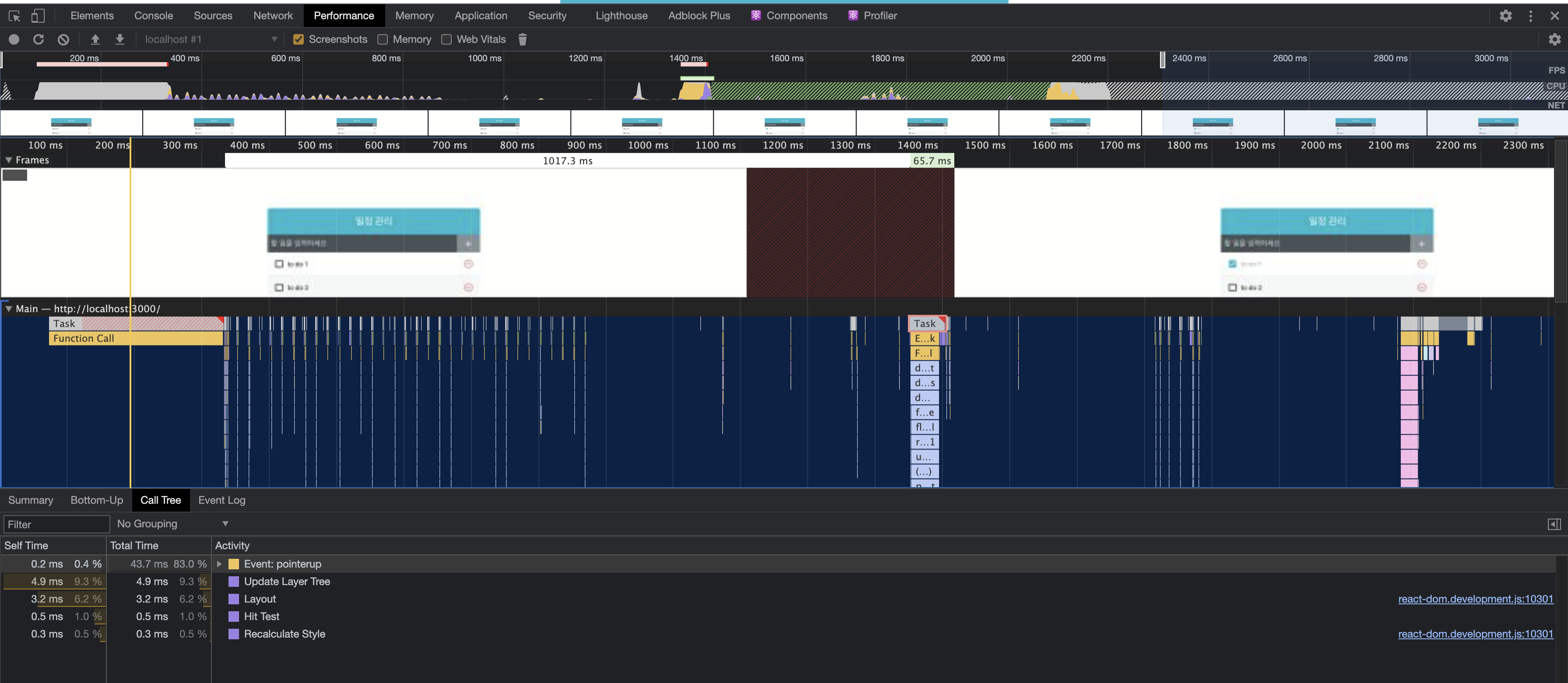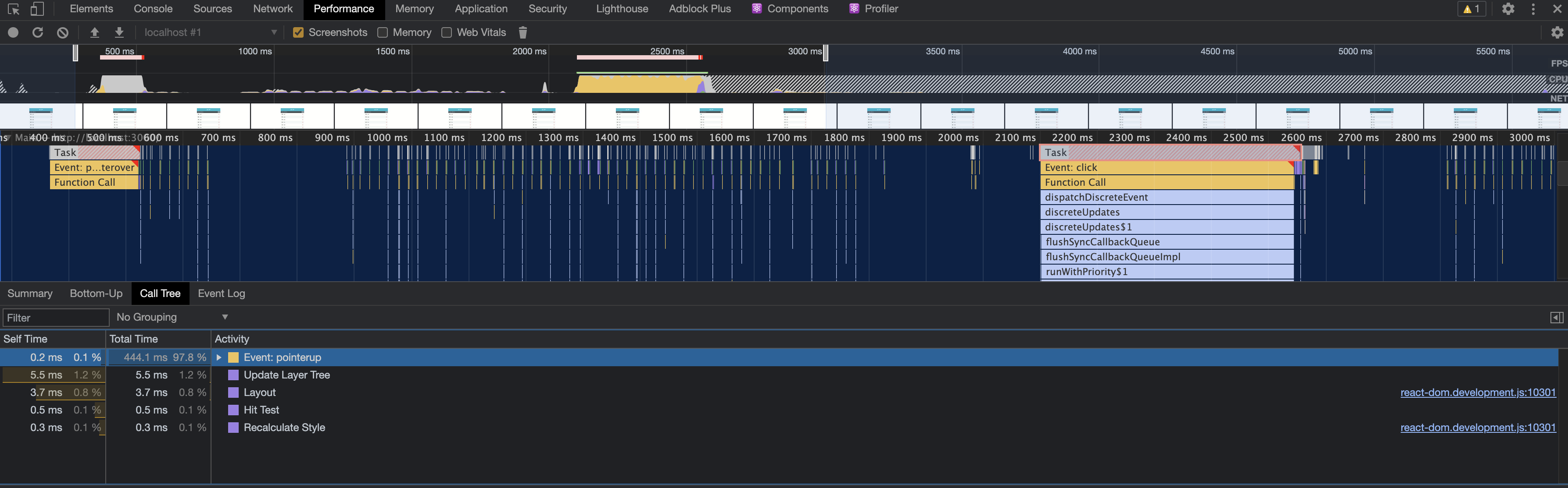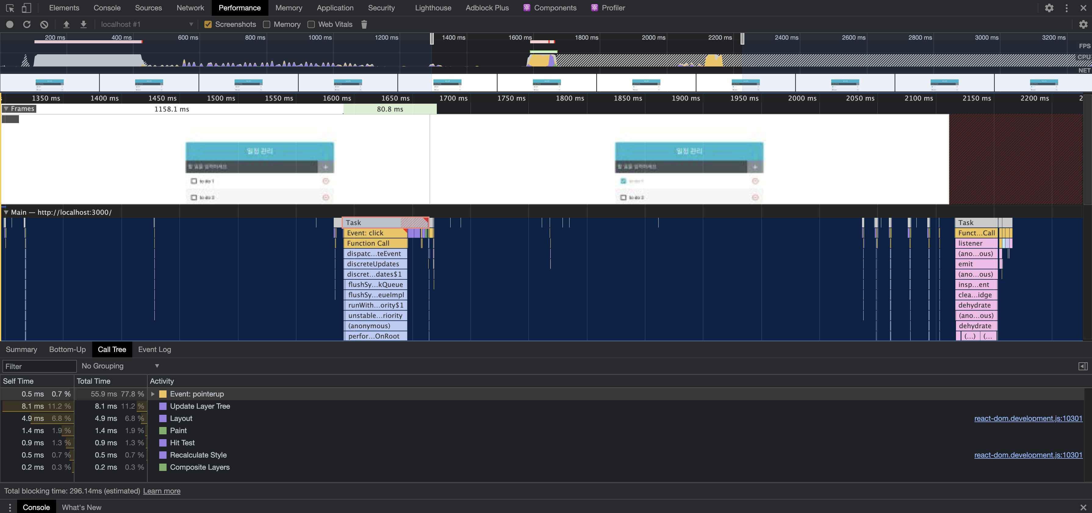 그 후 checkbox하나를 체크 하면서 크롬 개발자 툴에서 Performance를 통해 속도를 모니터링 해 보면 444.1ms 정도 걸린것을 볼 수 있다.