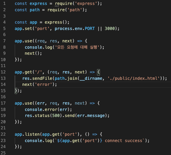 미들웨어는 기본적으로 조건이 충족되면 실행하고 다음으로 넘어가지 않는다. 따라서 미들웨어 맨 마지막에 next();를 추가해야 다음 미들웨어로 넘어간다. 또 한 try{....}catch(err}{next(err)};를 하게 되면 에러 발생 시 에러처리 미들웨어로 넘어간다.