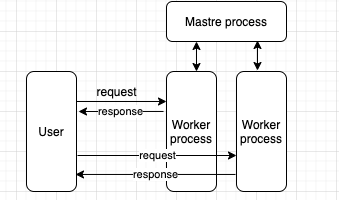 Nginx는 하나의 master process와 여러개의 worker process로 구성되 있다. Master process는 설정을 읽고, 유효성 검사와 worker process를 관리 한다. Worker porcess에서는 요청을 효율적으로 분배하기 위해 OS에 의존적인 메커니즘을 사용한다. Worker process의 갯수는 설정파일에서 정의되고 컴퓨터의 CPU 코어 수에 맞추어 worker process의 수가 자동으로 조정된다.