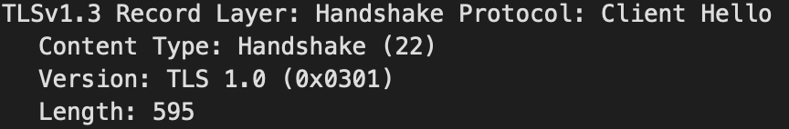 1. record layer는 Content Type, Version, Length 총 3개 파트로 나뉘어져 있고 Content Type은 패킷의 프로토콜 종류를 나타낸다. 따라이 이 예시는 Handshake 프로토콜이며 프로토콜 버전은 TLS 1.0이고 그 길이는 595이다 라는 의미이다.