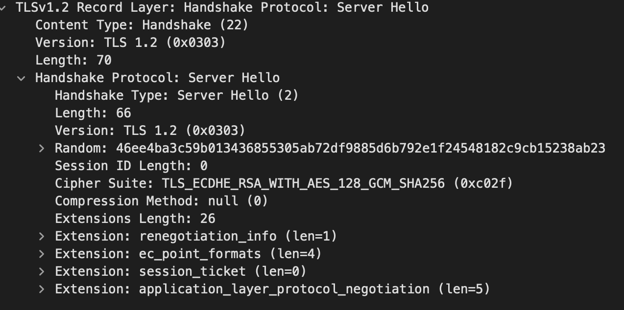 Serve Hello 역시 Client Hello와 비슷한 구조를 가지고 있으며 그 예시는 다음과 같다.