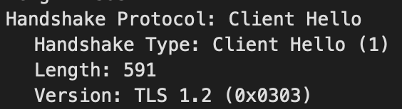 2. handshake 프로토콜 영역은 크게 Handsake Type, Length, Body부분으로 나뉘어진다. Handsake Type은 TLS handshake 과정 중에 현재의 과정을 의미한다. 따라서 이 예시는 handshake 과정 중 Client Hello 패킷이며, TLS버전은 1.2, 길이는 591이다 라는 의미이다.