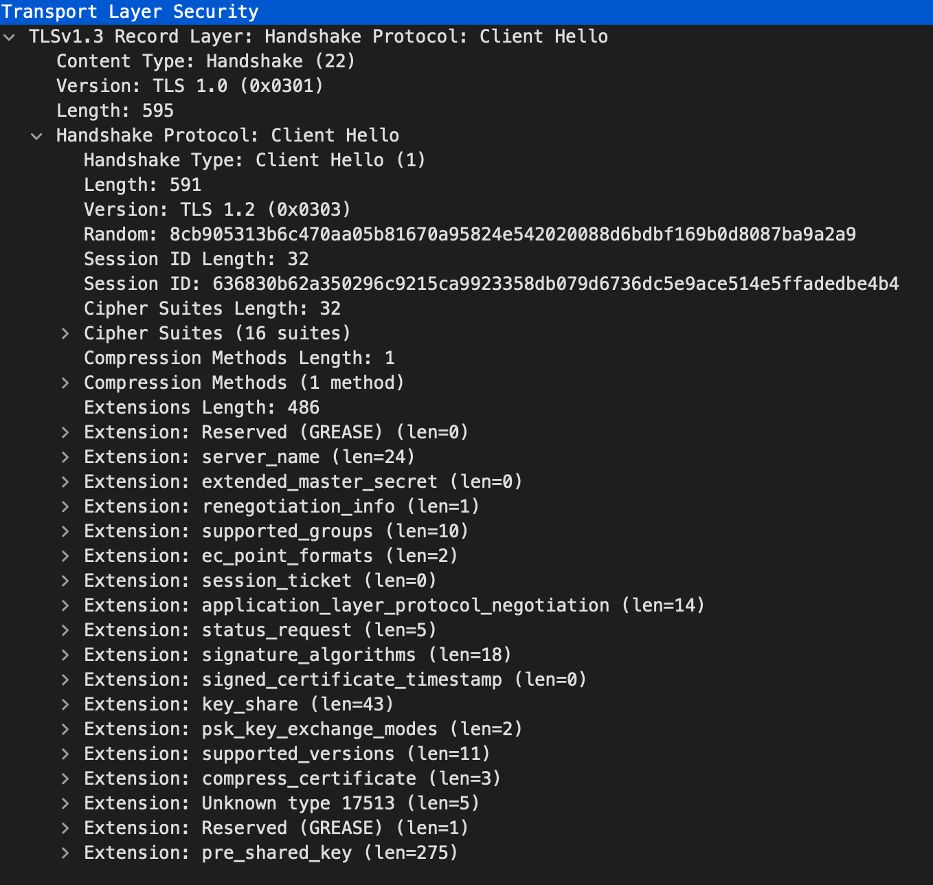 TLS handshake과정의 첫 단계이다. 이 단계는 클라이언트와 서버가 TLS 통신을 하기 위한 최초 협상 단계이다. 와이어샤크를 통해 캡쳐한 client hello 패킷은 다음과 같은 구조를 가지고 있다.
