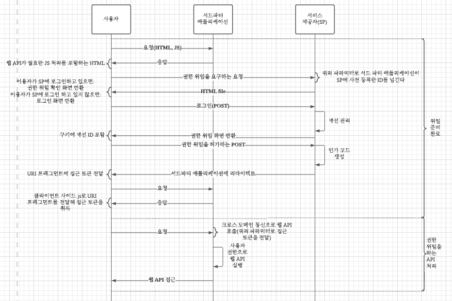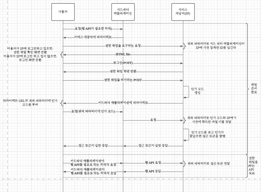 위에서 말했던거 처럼 웹 API를 사용할 때는 서비스 제공자, 서드파티 애플리케이션, 사용자라는 세 주체가 존재한다. 각 주체 간의 인증과 인가에는 권한 위임 같은 별도의 구조가 필요하다. 이런 구조를 분산 인증 시스템/프로토콜 또는 분산 인가 시스템/프로토콜이라 한다.