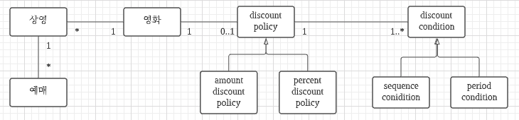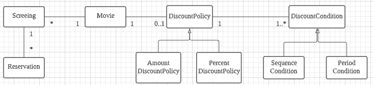 위의 class diagram을 말로 표현해 보면 "영화 예매 요금은 최대 하나의 '할인 정책'과 다수의 '할인 조건'을 이용해 계산 할 수 있다"가 된다. 이는 "영화 예매 요금은 '금액 할인 정책'과 '두개의 순서 조건, 한 개의 기간 조건'을 이용해 계산할 수 있다"를 포괄한다.