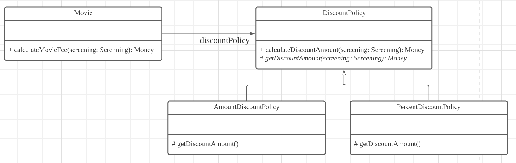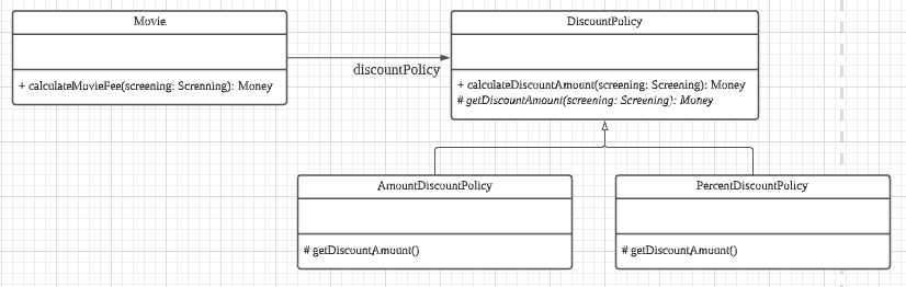 이러면 Movie의 인스턴스를 생성할 때 생성자 인자로 NoneDiscountPolicy인스턴스를 넘기면 된다.