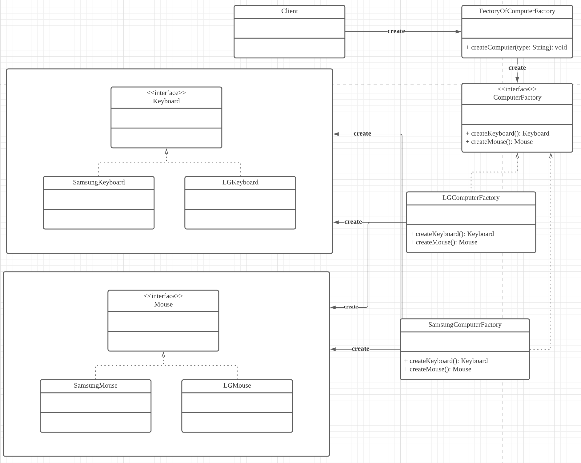 컴퓨터와 컴퓨터 주변 기기를 생산한다고 해보자. 컴퓨터와 컴퓨터 주변 기기는 모두 같은 기업의 제품이여야 한다. 여기서는 키보드와 마우스를 생산한다고 가정하고 팩토리 패턴을 사용해 설계를 해보자.