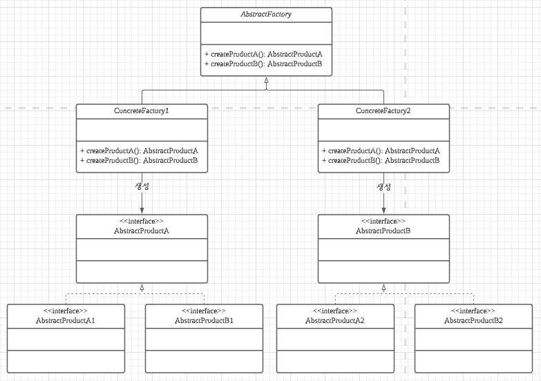 이렇듯 팩토리 패턴은 하나의 상속구조를 가진 경우에는 유용하지만, 여러개의 서로 다른 상속 구조를 가진 객체들과 상호작용 할때는 코드가 난잡해 지는 문제가 있다. 이 문제는 추상 팩토리 패턴을 사용하면 해결할 수 있다.