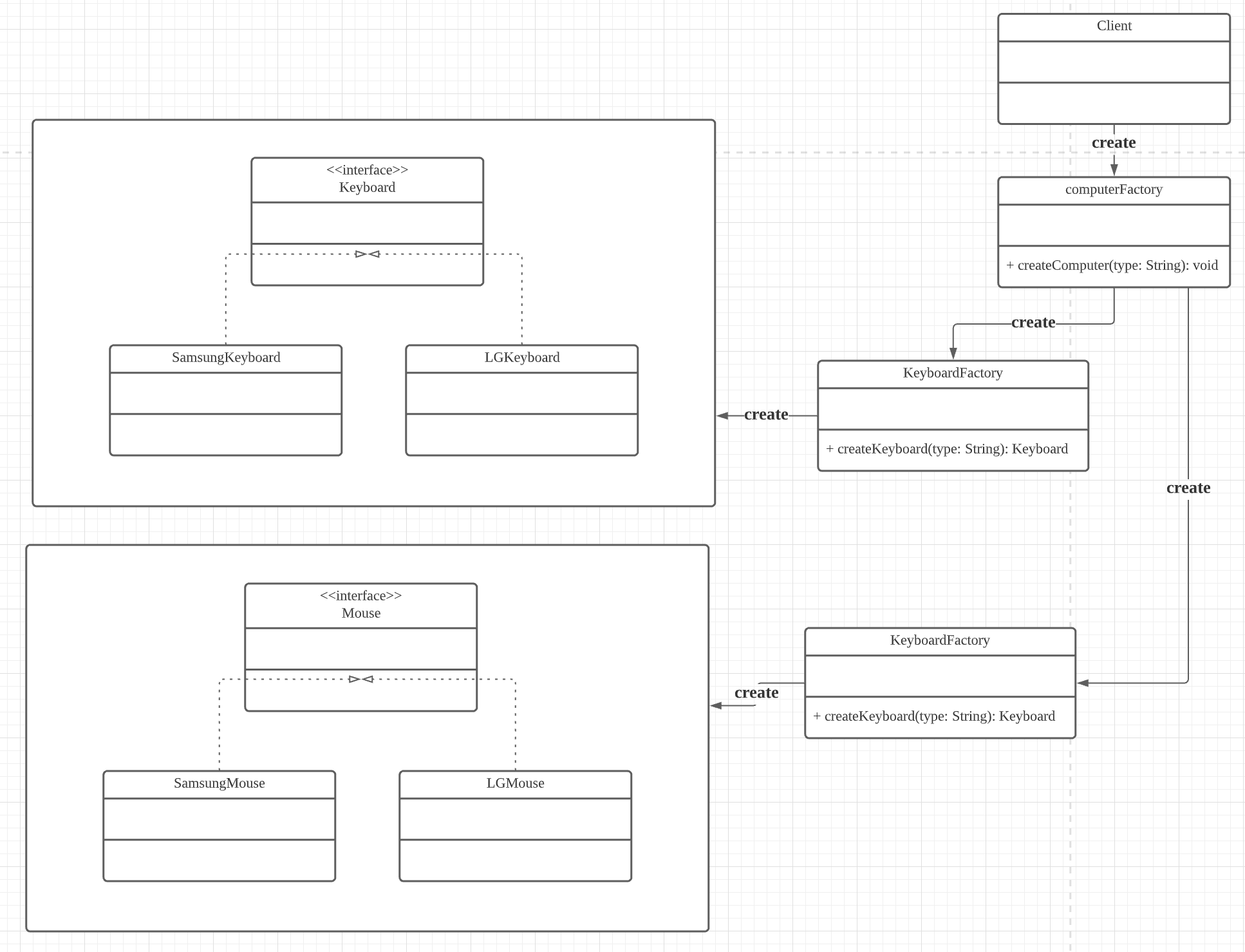 컴퓨터와 컴퓨터 주변 기기를 생산한다고 해보자. 컴퓨터와 컴퓨터 주변 기기는 모두 같은 기업의 제품이여야 한다. 여기서는 키보드와 마우스를 생산한다고 가정하고 팩토리 패턴을 사용해 설계를 해보자.