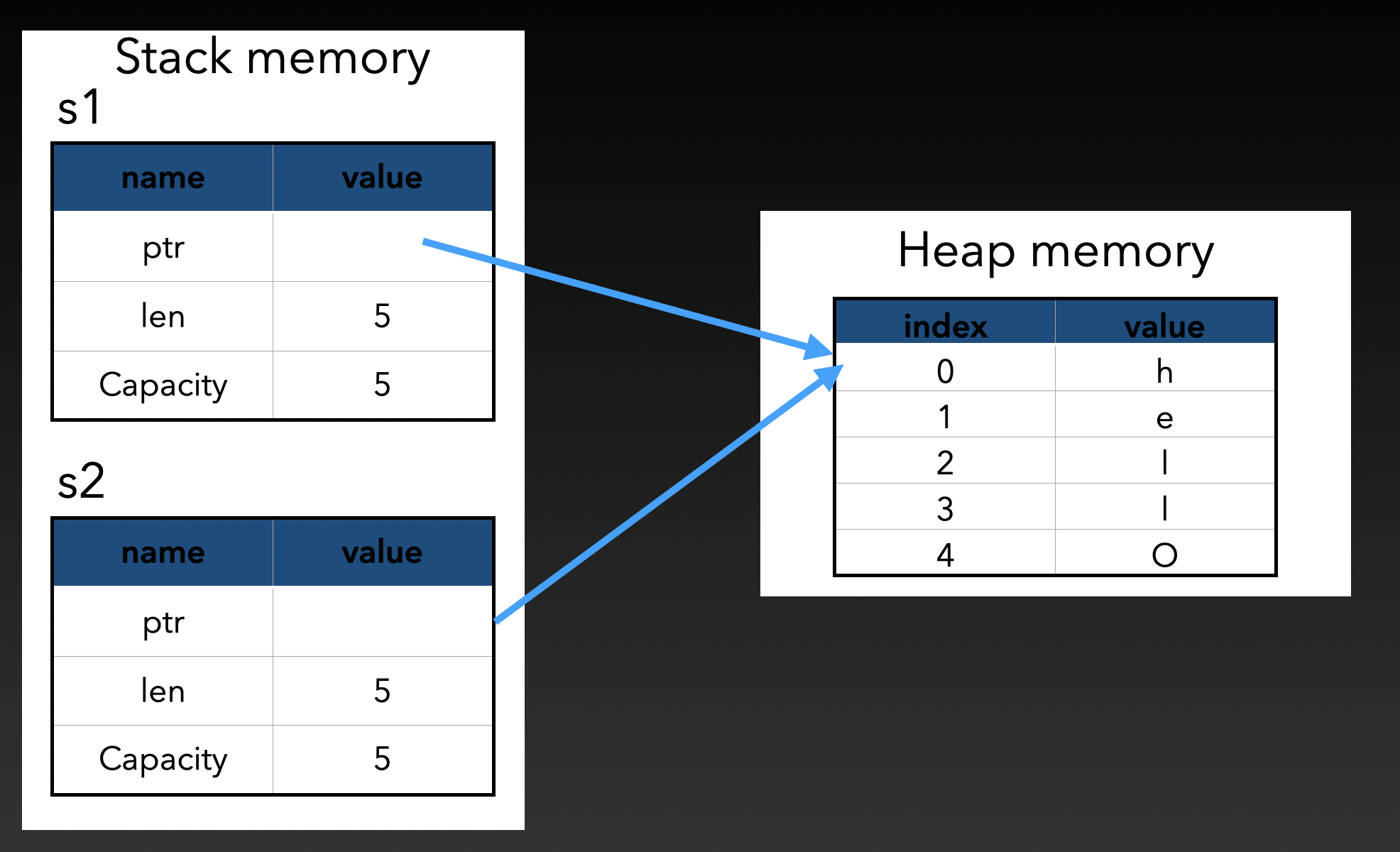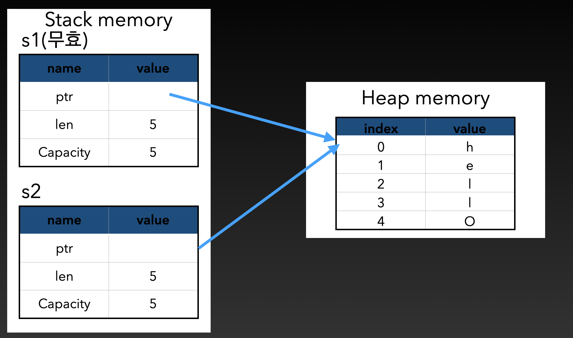 두 번째 줄이 실행되면 String 데이터가 복사된다. 여기서 복사는 스택에 존재하는 ptr, len, capacity가 복사된다는 의미이다. 따라서 다음과 같은 구조가 된다.