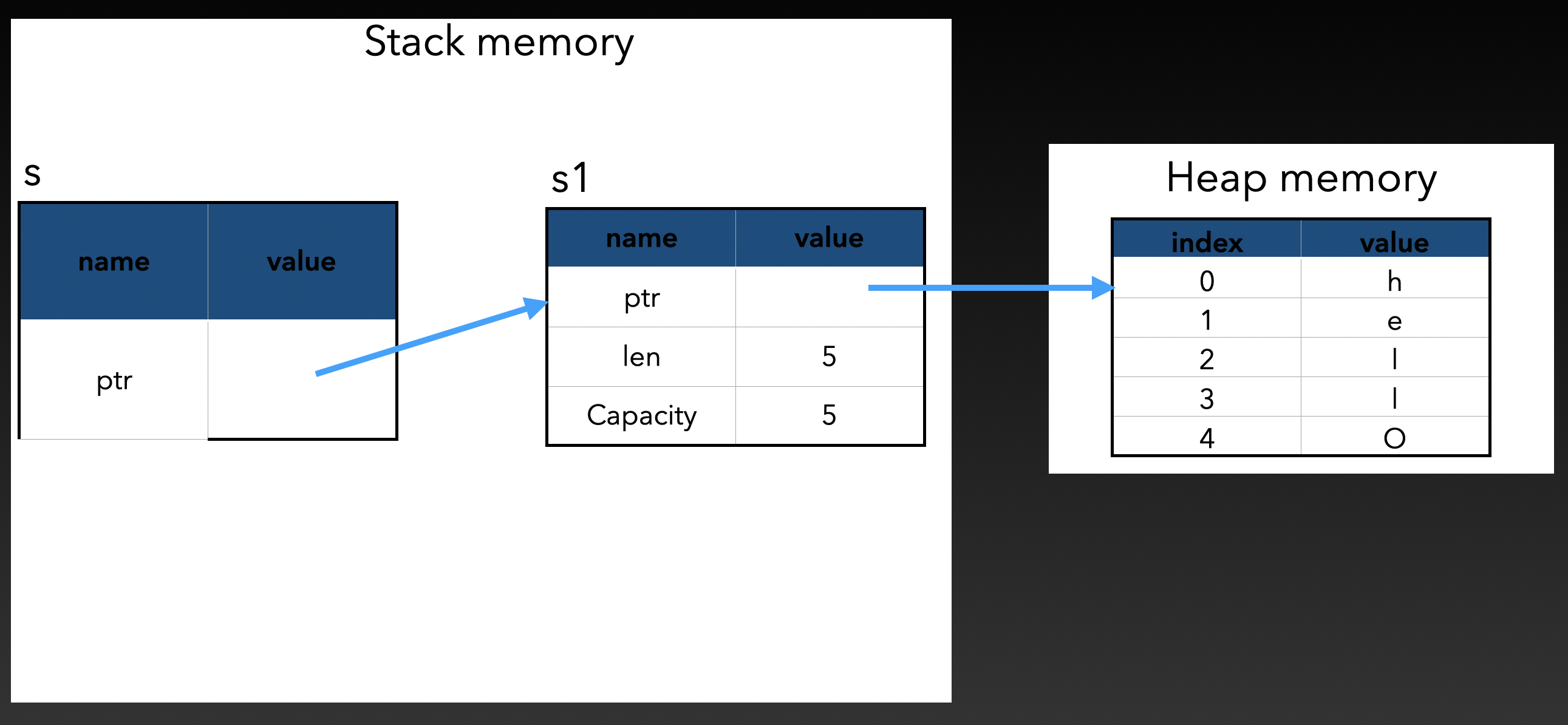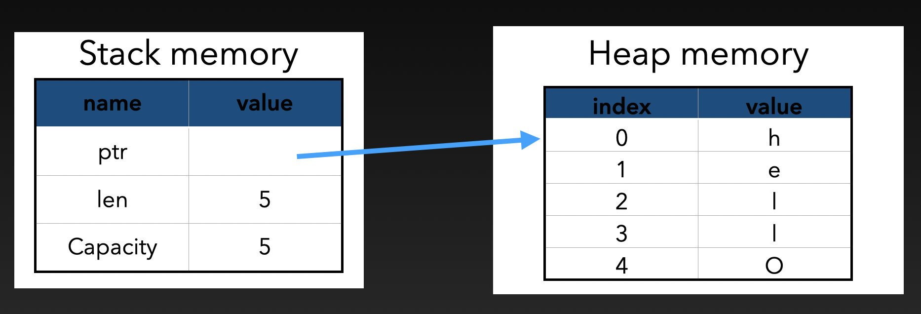 이 코드에서 첫번째 줄은 다음과 같은 구조를 가지고 있다.(String은 메모리의 포인터, 길이, 용량 총 3개의 부분으로 이루어져 있다.)