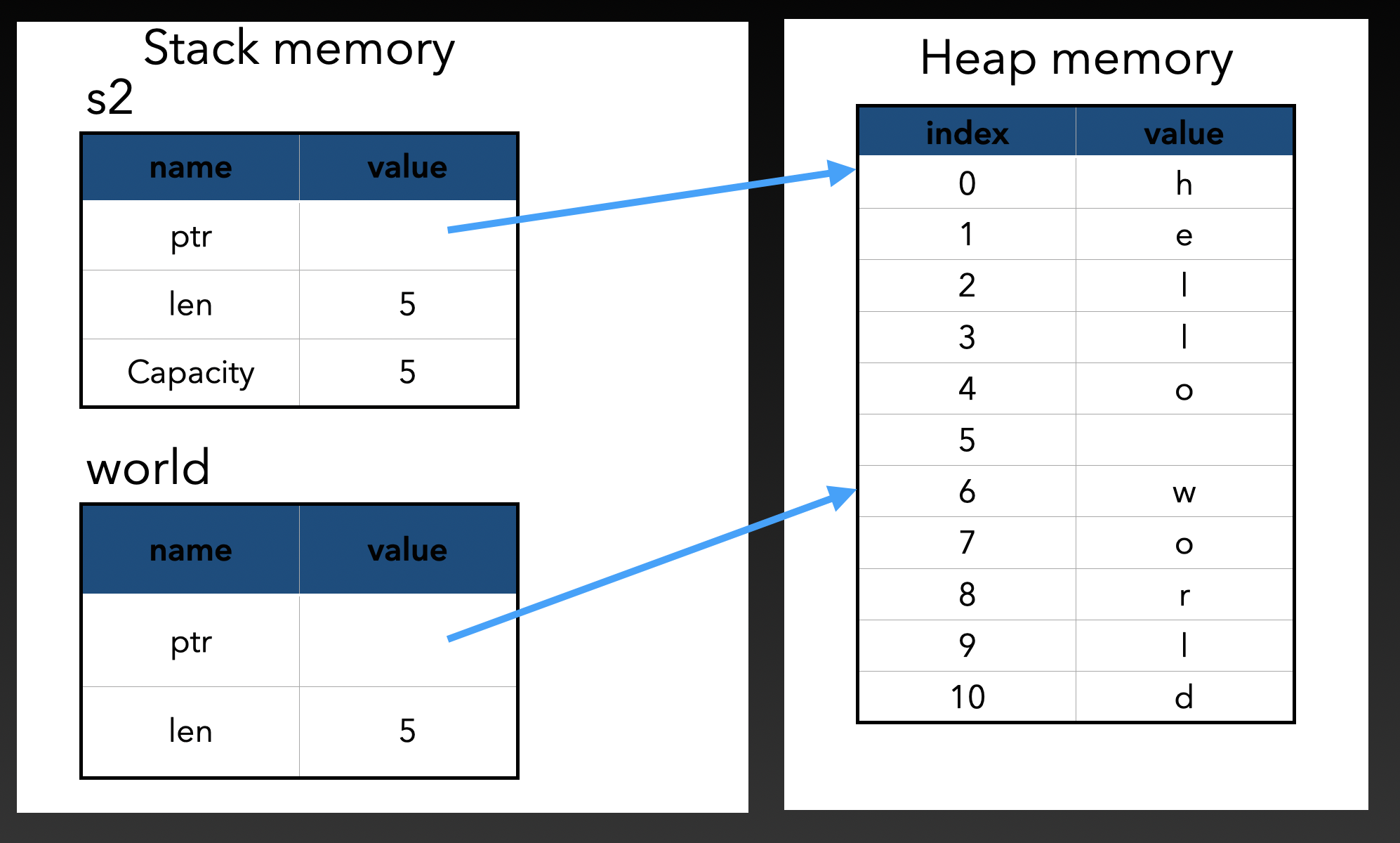 대괄호 내에는 [시작 인덱스..끝인덱스 + 1]를 통해 범위를 특정할 수 있다. 내부적으로는 시작 위치와 슬라이스의 길이를 저장한다. 따라서 let world = &s[6..11]이면 다음과 같은 구조를 갖는다.