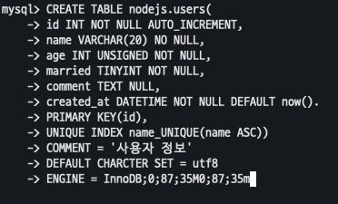 테이블을 생성할때는 만들테이블의 컬럼명과 각 컬럼명에 해당하는 설정 그리고 테이블 옵션이 들어간다
