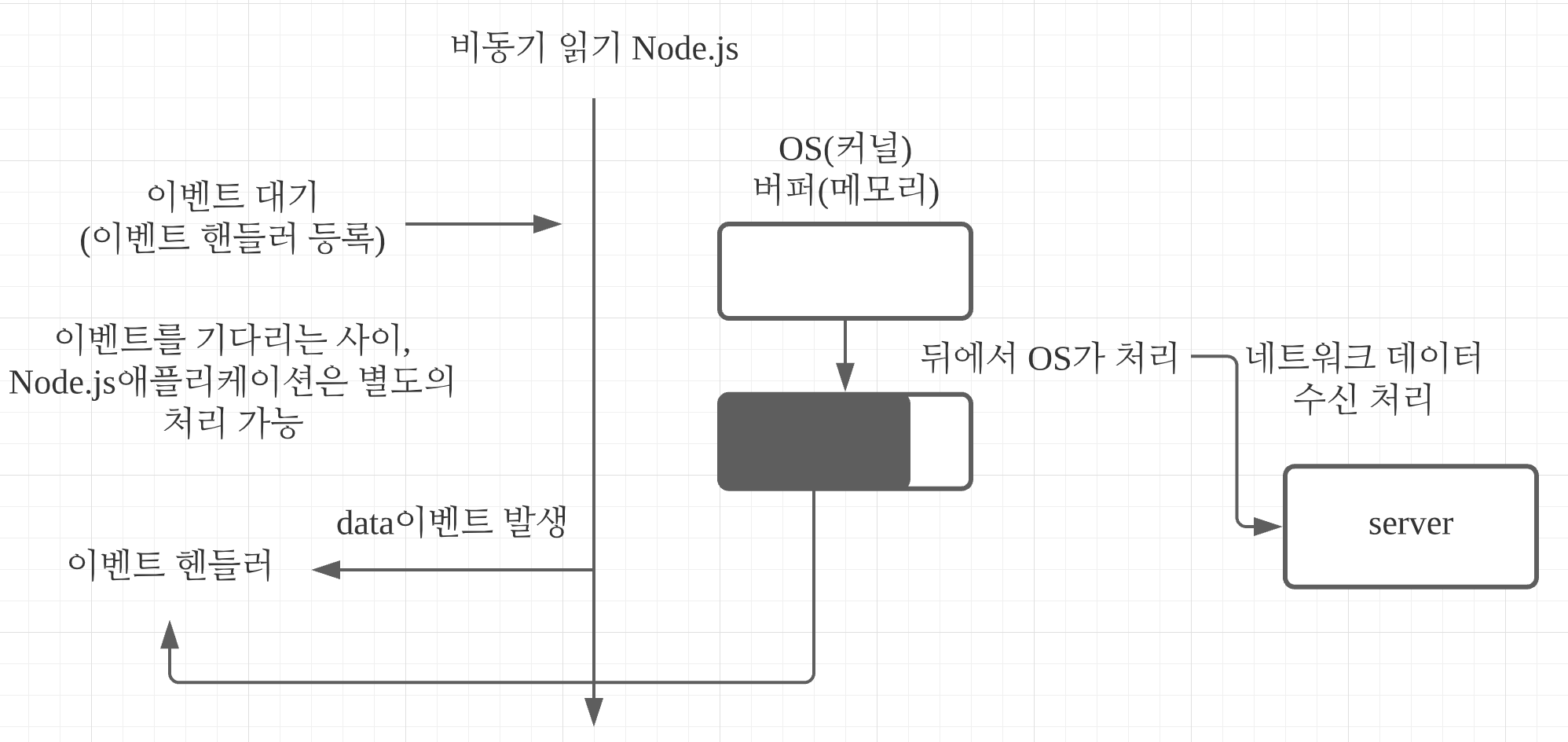 Node.js의 비동기 읽기 처리에 대응하는 함수나 메서드가 존재하지 않는다. 읽기는 이벤트에 대한 콜백으로 이루어진다. 이벤트명은 data가 일반적이다. 뒤에서 읽기 처리가 완료되고 데이터가 메모리에 있는 상태로 콜백 함수가 호출된다. 콜백 함수의 인자로 읽기 데이터를 받는다. 읽기 처리가 계속되는 경우 콜백 함수가 차례로 호출된다. 여기서 일반 함수와의 차이가 존재한다. 일반적인 함수 호출에서는 함수에 넘기는 인자를 입력해 반환값이 출역되지만 콜백 함수를 사용하는 비동기 처리에서는 콜백 함수의 인자 형태로 출력을 얻는다.