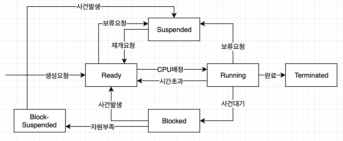 생성된 프로세스는 종료될 때까지 운영체제에 의해 다음과 같은 상태를 오가면서 진행된다.