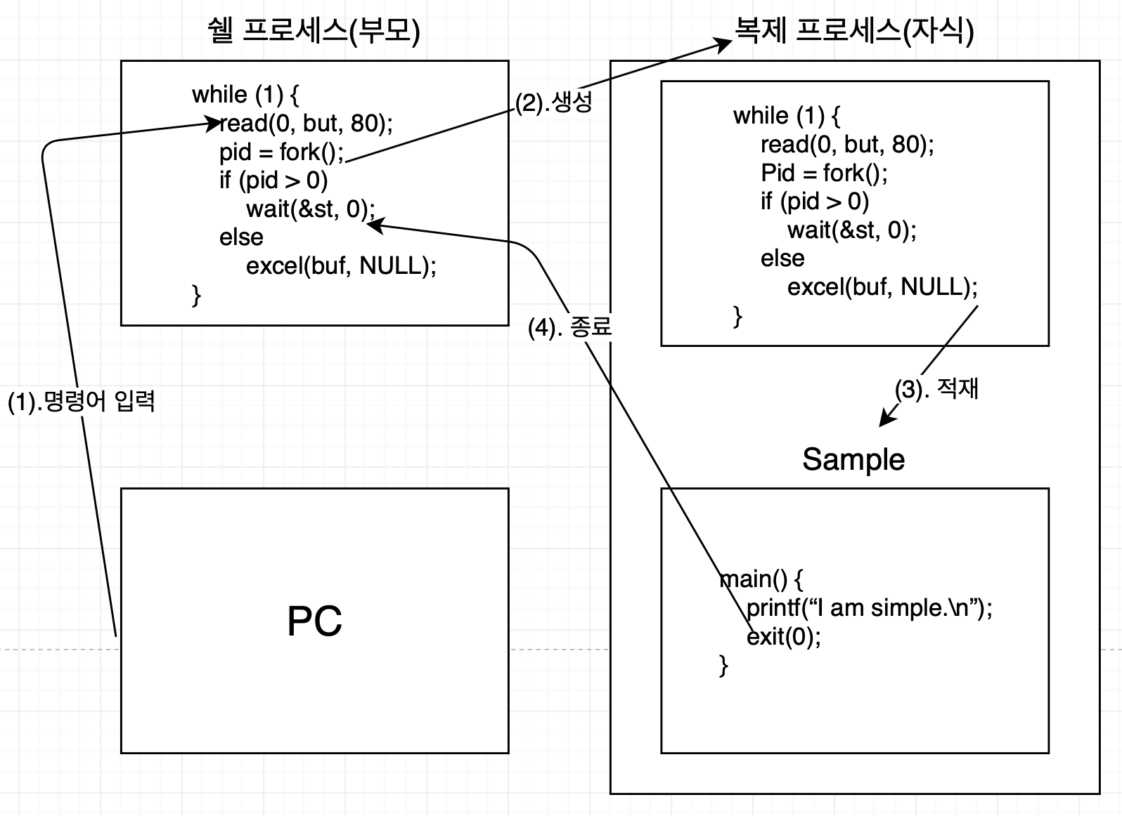 2. 사용자로부터 문자열 'sample'을 입력 받은 쉘 프로세스가 유닉스 운영체제의 fork() 시스템 콜을 호출하면, 운영체제는 fork()를 요청한 프로세스 즉, 쉘프로세스와 동일한 프로세스를 복사, 생성해 새로운 프로세스 자리를 확보한다. 이 때 부모 프로세스는 물론, 자식 프로세스도 fork()에서 복귀하는 과정부터 실행이 이어진다. 다만, 부모 프로세스에서의 fork()의 복귀 값은 자식 프로세스의 id(> 0)이고, 자식 프로세스에서의 복귀 값은 0이다.