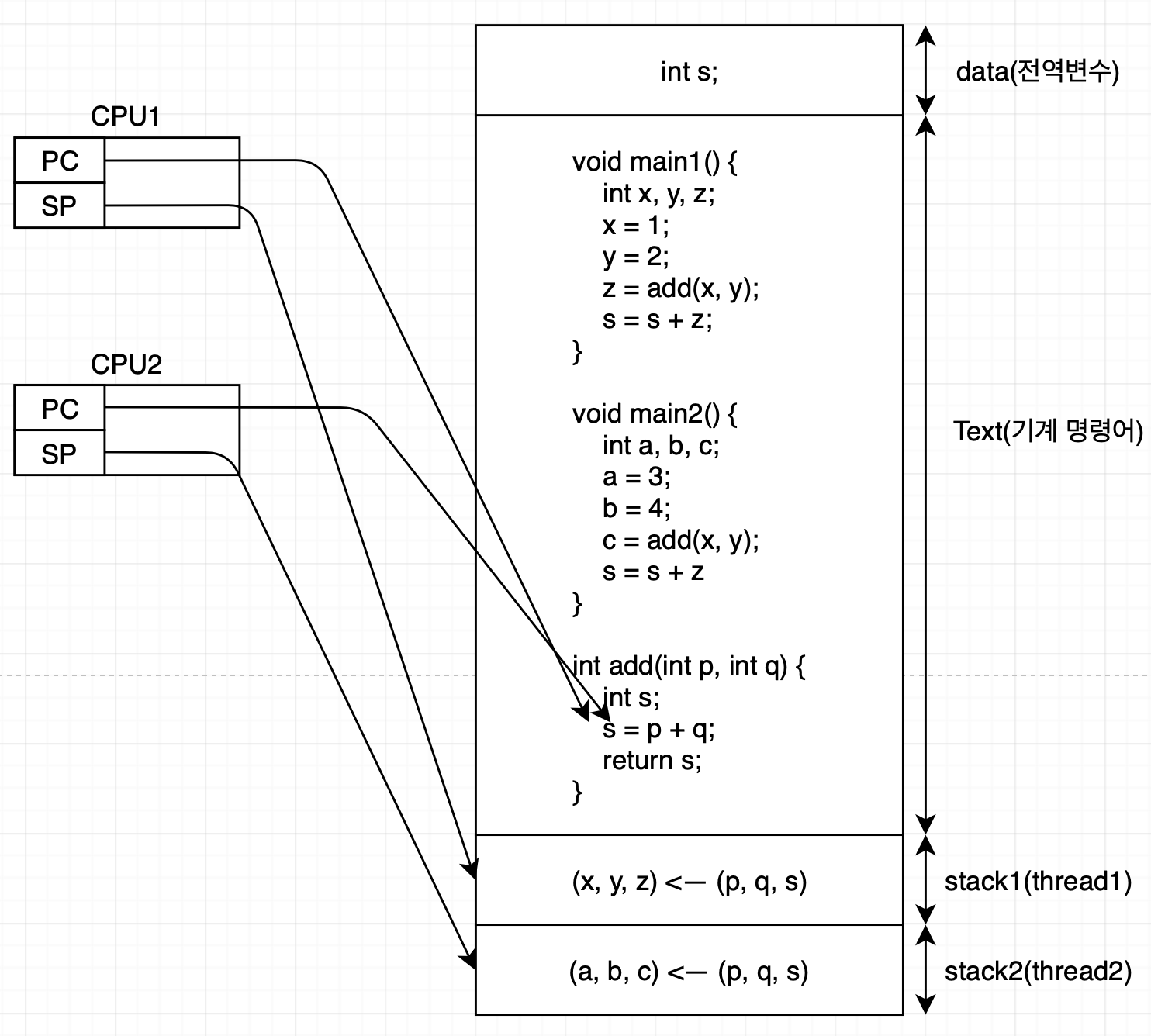 스레드들이 동일한 기계 명령어를 실행해도 연산 과정이 고유하게 유지된다. 이는 기계 명령어는 동일해도 피연산자를 위한 최종 목적 주소가 분리 되는 원리다. add 함수에서 상요되는 모든 변수는 지역 변수들이다. 지역 변수들은 모두 CPU내에 존재하는 SP(Stack Pointer)에 저장된 주소값을 기준으로 한 상대적 거리로 참조된다. 따라서 thread1을 위한 CPU1의 SP 값과 thread2를 위한 CPU2의 SP 값을 다르게 설정하면 add 함수의 기계어 코드는 동일하지만 그 기계어 코드가 참조하는 최종 피연산자 주소는 다르다. 이와 같이 스레드들의 연산 고유성을 유지하기 위한 저장 공간을 stack 영역이라 한다. stack 영역은 스레드가 시작할 때 할당되고 해당 스레드를 실행하는 CPU의 SP 값은 할당된 스택 영역으로 초기화된다.