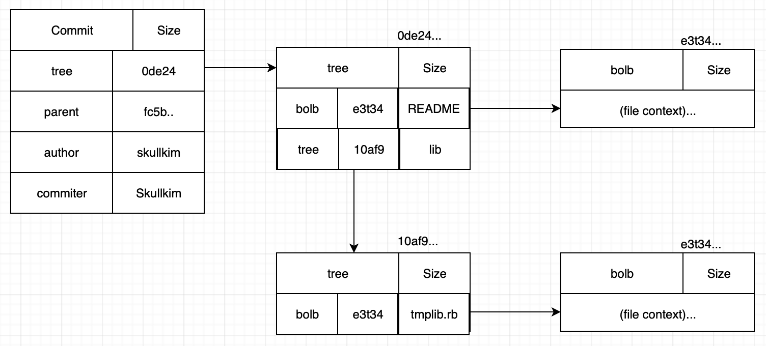 즉, git add를 하면 blob 객체가 생성되고 git commit을 하면 tree 객체와 commit 객체가 생성된다. 따라서 두 개의 파일을 add 하고 commit했다면 해당 commit을 다음과 같은 객체를 갖는다.