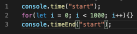실행 시간을 측정하고 싶은 코드 맨 위에 console.time()을, 맨 끝에 console.timeEnd()를 추가하면 콘솔에서 해당 코드의 실행 시간을 볼 수 있다.