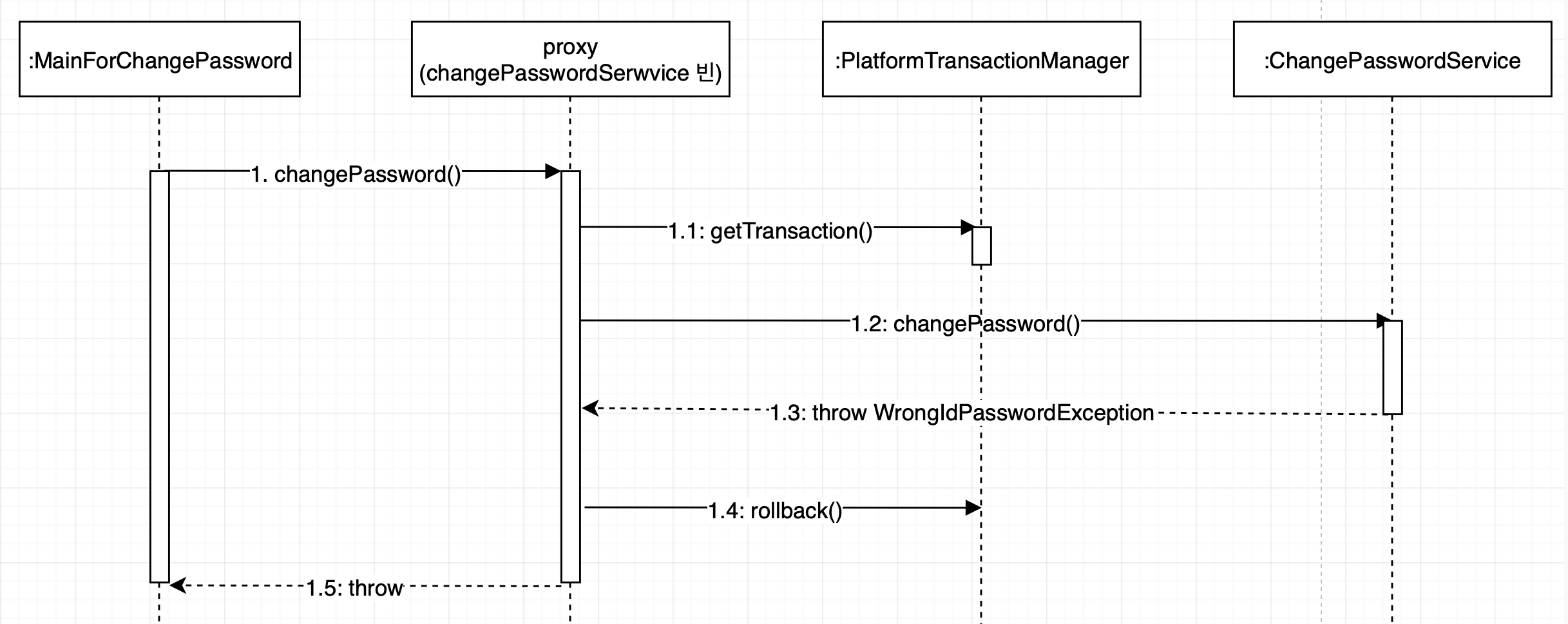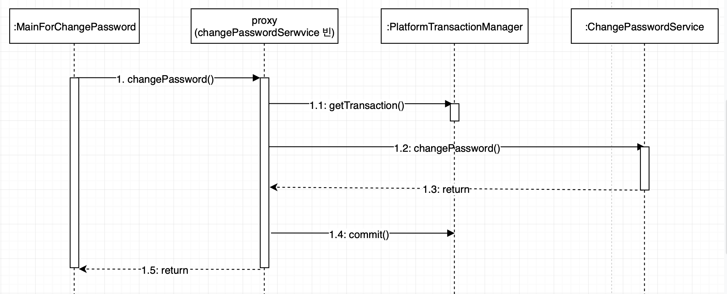 프록시 객체는 @Transactional 어노테이션이 붙은 메서드를 호출하면 PlatformTransactionManager를 사용해 트랜잭션을 시작한다. 그 후 실제 객체의 메서드를 호출하고 성공적으로 실행되는 트랜잭션을 커밋한다.