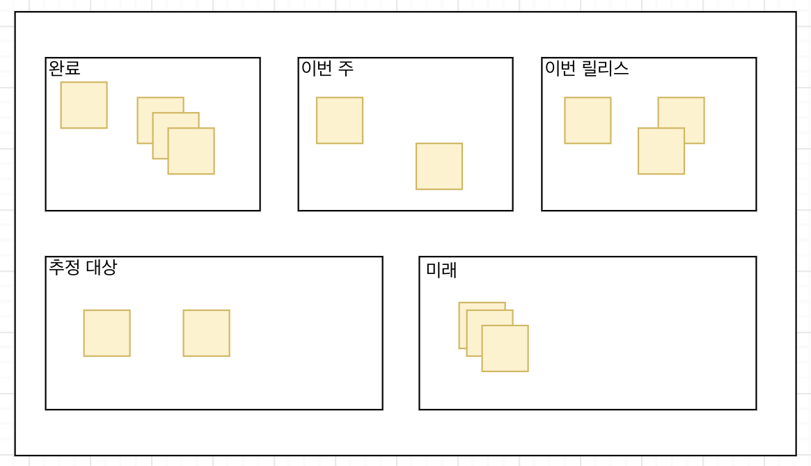 많은 팀이 이를 위해 스토리 카드를 붙인다. 카드를 일정한 기준에 맞춰 공간상으로 정렬하면 정보를 빠르게 파악할 수 있다. 아래 그림은 공간상으로 정렬된 스토리 카드가 붙은 이상적인 스토리 벽의 모습이다.