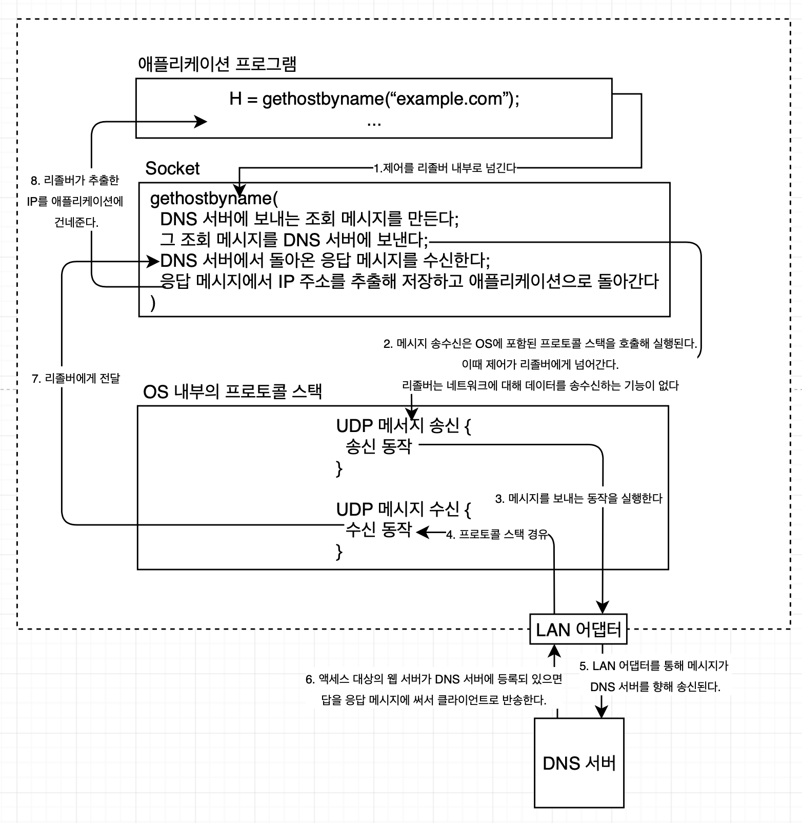 리졸버는 소켓 라이브러리에 존재하는 부품화한 프로그램이다. 소켓 라이브러리는 OS에 포함된 네트워크의 기능을 애플리케이션에서 호출하기 위한 부품을 모아놓은 것이다.