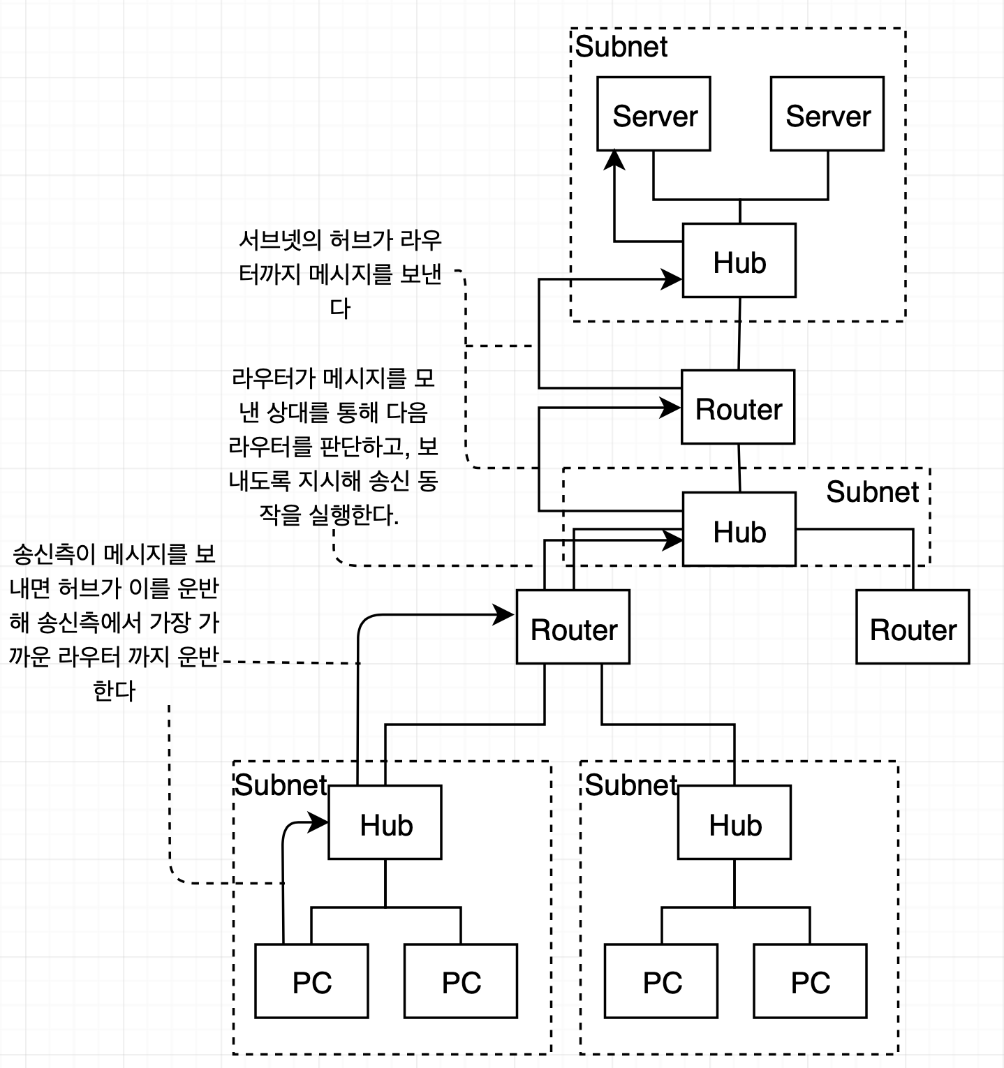 TCP/IP 네트워크는 서브넷이라는 작은 네트워크를 라우터로 연결해 전체 네트워크를 완성한다. 여기서의 서브넷은 허브에 몇 대의 PC가 접속된 것이다. IP는 네트워크 번호와 호스트 번호로 나뉘어져 있다. IP의 네트워크 번호는 서브넷에 할당되고, 호스트 번호는 컴퓨터에 할당된다.
