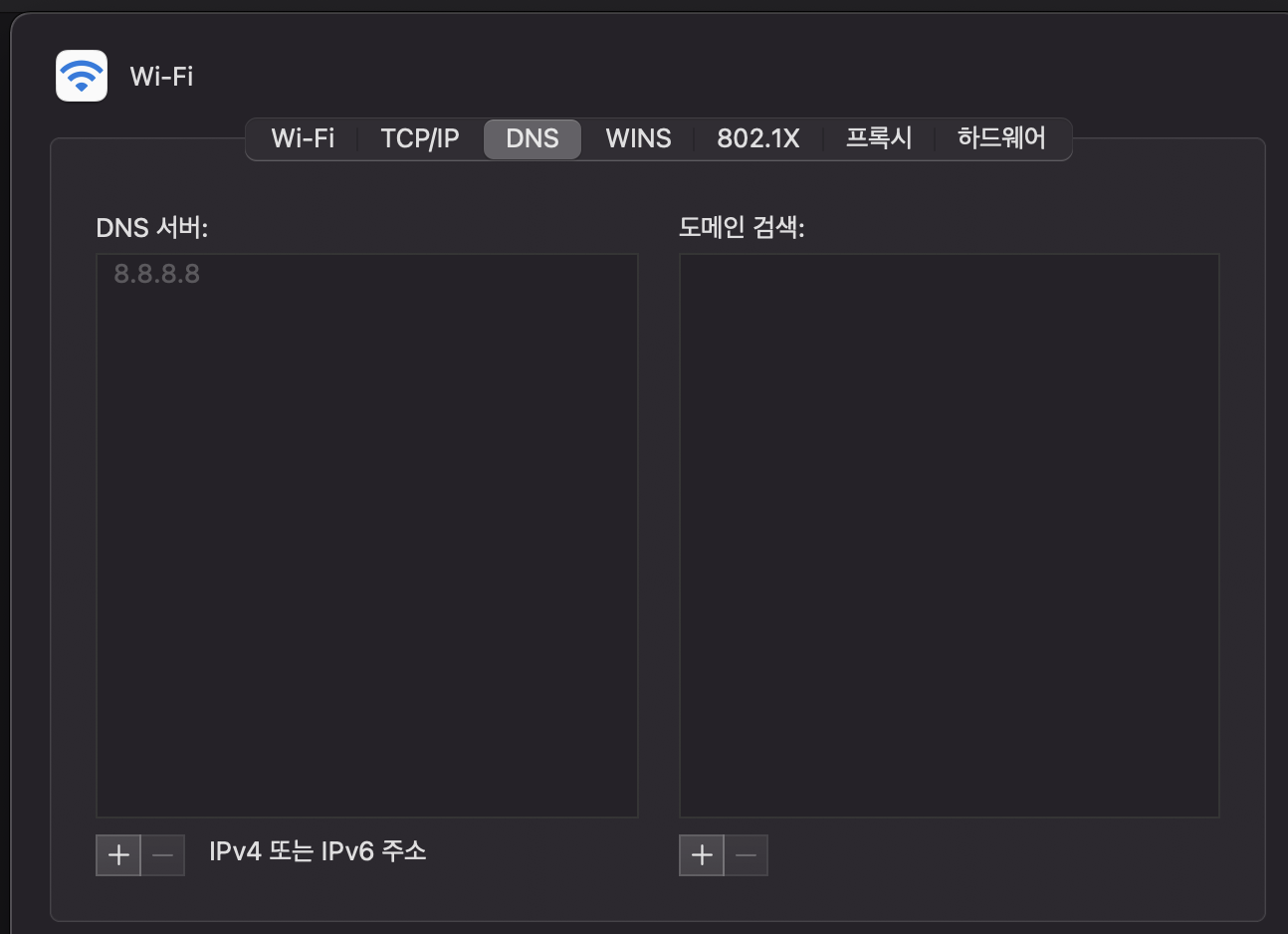 DNS 서버에 요청을 할때도 DNS 서버의 IP가 필요하다. 이는 TCP/IP 설정 항목 중 하나로 컴퓨터에 미리 설정되 있다. 현재 내 맥에 설정된 DNS IP는 다음과 같다.
