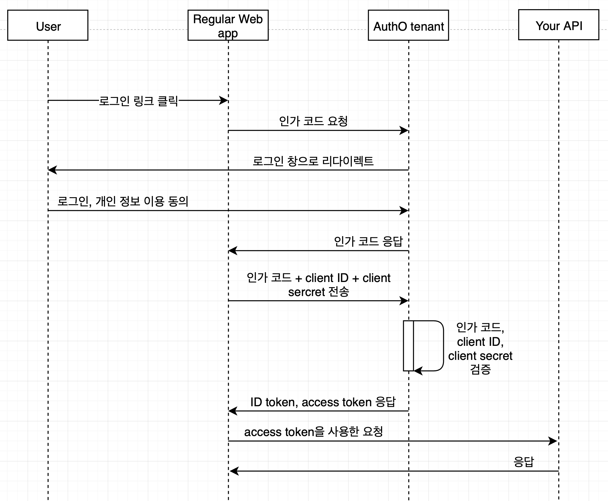 PKCE의 장점을 더 잘 이해하기 위해 기존의 authorization code flow를 보자. 이는 SSR을 상정하고 나온 플로우이기 때문에 정적인 client sercret을 그대로 전송하게 된다. 해당 플로우는 OAuth 2.0 RFC 6749, section 4.1에 정의되 있다.