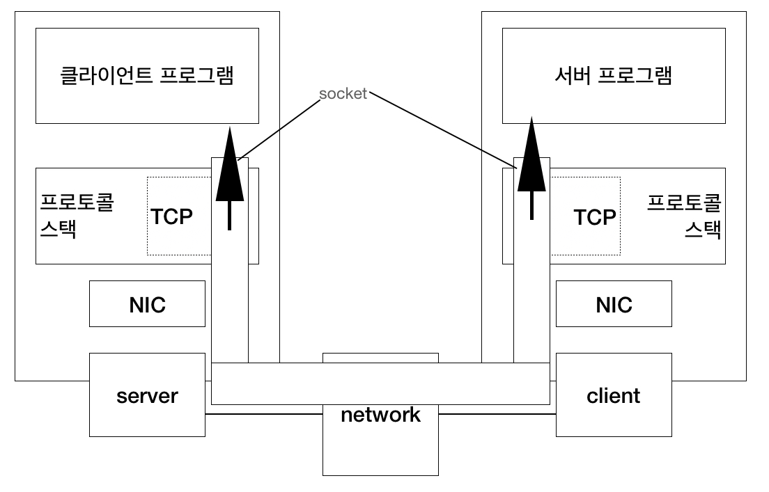 위 그림에 존재하는, 클라이언트의 소켓과 서버 소켓을 연결하는 파이프를 만들기 위해선 양자를 파이프로 연결하는 동작이 필요하다. 이 파이프에 존재하는 두 출구를 소켓이라 한다. 서버의 소켓이 만들어 지고 클라이언트가 파이프를 연결하길 기다린다. 그러면 클라이언트에서도 소켓을 만들고 소켓에서 파이프를 늘려 서버의 소켓에 연결한다. 그 후, 데이터 송/수신 동작이 시작된다.