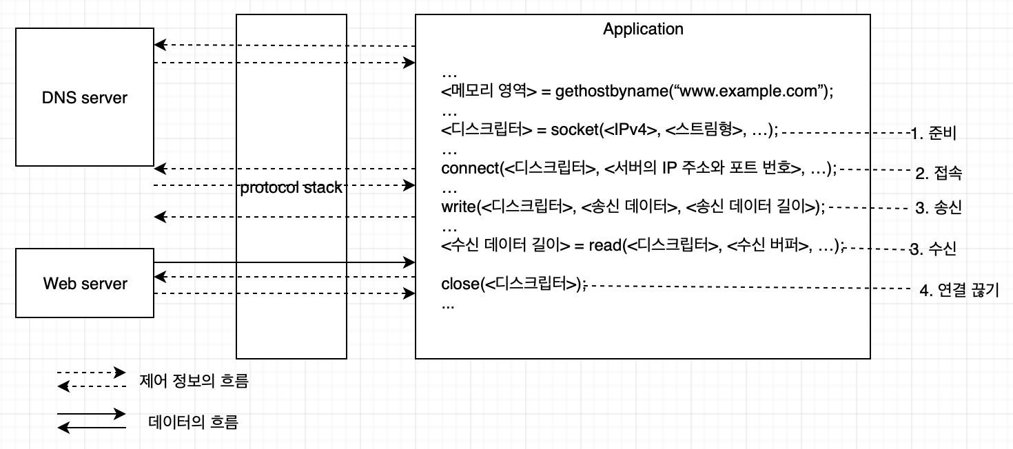 위 네 가지 동작은 OS 내분의 프로토콜 스택에서 실행된다. 즉, 애플리케이션은 자체적으로 파이프를 연결개 데이터를 쏟아 붇지 않고 프로토콜 스택에 의뢰한다. 소켓에 존재하는 데이터 송/수신용 라이브러리는 애플리케이션에서 호출한 내용을 그대로 프로토콜 스택에 전달하는 역할만 한다.