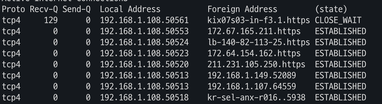| CLOSE-WAIT | TCP 연결이 애플리케이션 레이러로 부터 연결 종료를 대기하는 상태 |