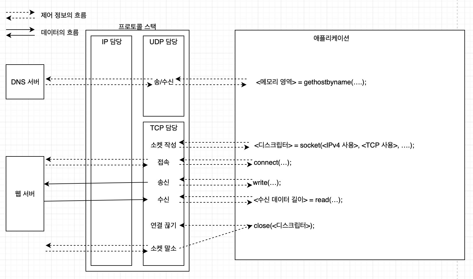 네트워크 애플리케이션이 Socket 라이브러리를 통해 프로토콜 스택에 의하는 동작은 다음과 같다.