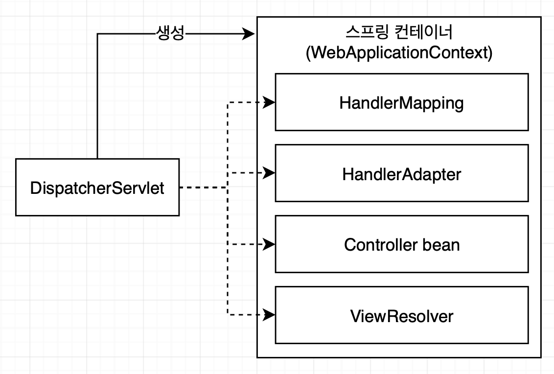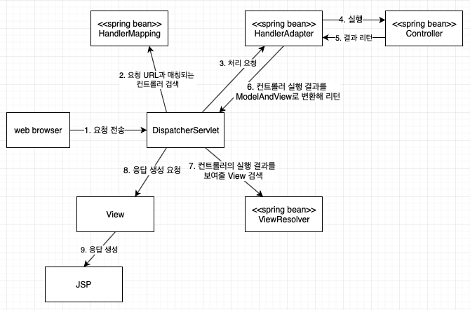 스프링 MVC의 핵심 수성 요소와 그들의 관계를 정리하면 다음과 같다. 이 관계도는 API가 아닌 페이지를 응답하는 기준으로 작성되었다.