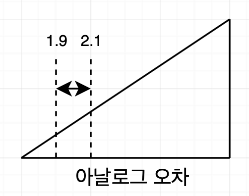 예를 들어 한 회로가 9.9V ~ 10.1V의 범위에서 정확한 전압을 제공한다 해보자. 이 때 12V 전압과 비교한다면 차이는 1.9V~2.1V가 된다. 이 차이를 아날로그 관점에서 보면 다음과 같이 범위의 차이가 존재한다. 따라서 이 범위의 오차 중 어느 전압을 보고할지 알 수 없다.