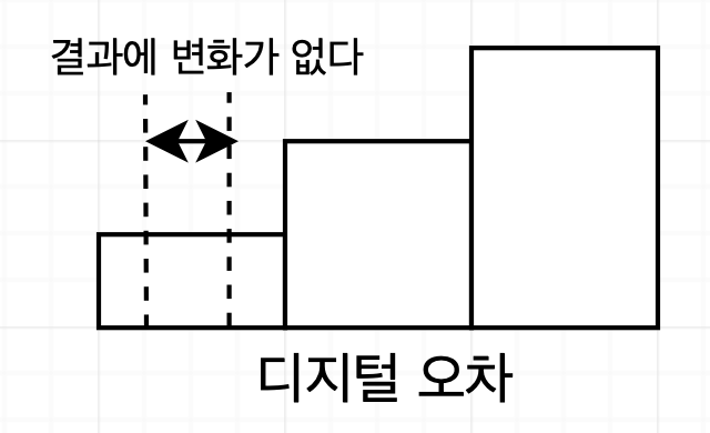 물론 오차를 엄격히 통제하는 것도 하나의 방법이다. 하지만 오차 통제는 엄격하게 제한된 환경 아래에서만 가능하다. 따라서 아날로그의 결과 판독을 무한히 세분화할 수 있는 것과 의미 있는 정보를 얻는 것은 별개의 얘기다. 그에 반해 디지털은 오차에 관용적이다. 다소 조건이 변해도 결과가 변하지 않는다. 따라서 디지털을 활용하는 것이 원하는 동작을 하는 기기를 만들기 쉽다.