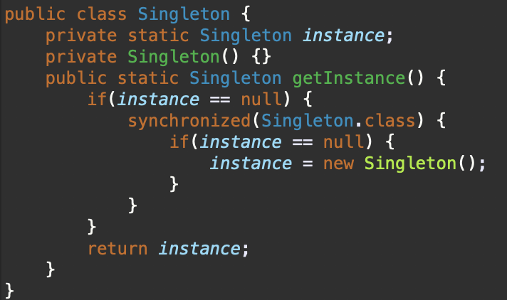싱글톤은 인스턴스가 오직 하나만 존재해야 하므로 생성자가 외부에 드러나 있으면 안되고 클래스 변수를 사용한다.