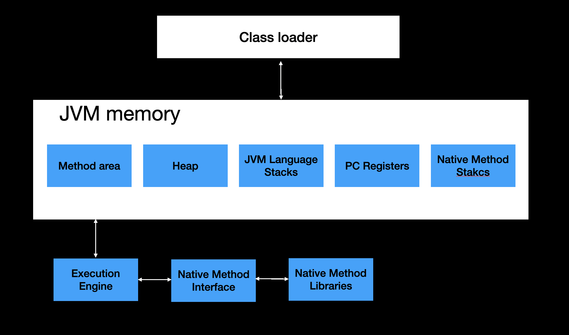 JVM은 자바 애플리케이션드을 실행하는 런타임환경을 위한 명세서이다. Hotspot JVM이 이 명세서의 사용 예시다. 이는 클래스파일들을 로드하고 interpreter와 JIT 컴파일러로 바이트코드를 machine coded로 변환하고 실행한다.