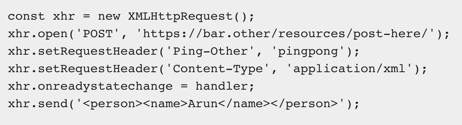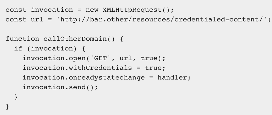 https://foo.example의 웹 컨텐츠가 https://bar.other도메인의 컨텐츠를 호출하길 원한다 하자. 여기서 foo.example이 다음과 같은 자바스크립트 코드를 사용한다면
