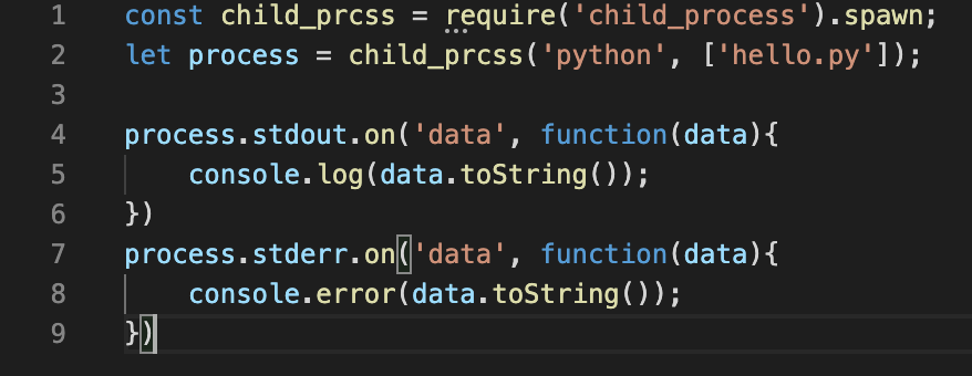 노드에서 child_process를 사용하면 다른 언어로 작성한 코드를 실행 시킬 수 있다. 노드에서 멀티스레딩을 하는 경우 멀티스레딩 부분을 노드에서 직접 작성하는것 보단 다른 언어로 작성하는것이 더 쉽다. 다른 언어를 작동시킬때 노드가 직접 해당 코드를 돌리는게 아닌 해당 언어의 컴파일러가 그 코드를 실행시키므로 child_process를 사용할 언어의 컴파일러가 설치되 있어야 한다.
