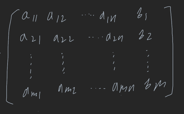 연립 방정식은 방정식과 미지수의 수가 증가할 수록 해를 찾기 어렵다. 이때는 연립방정식을 다음과 같은 첨가행렬로 바꿀 수 있다.